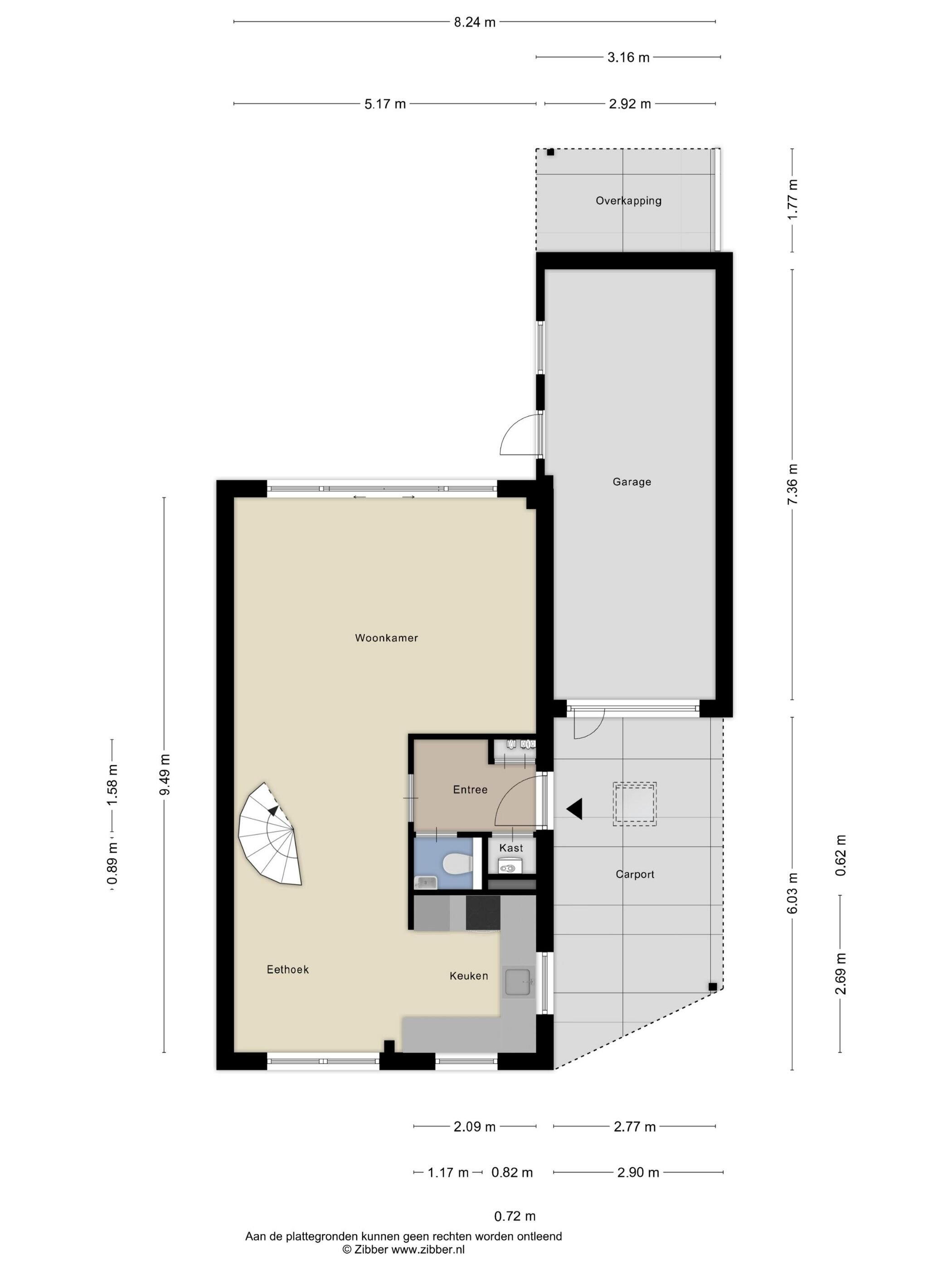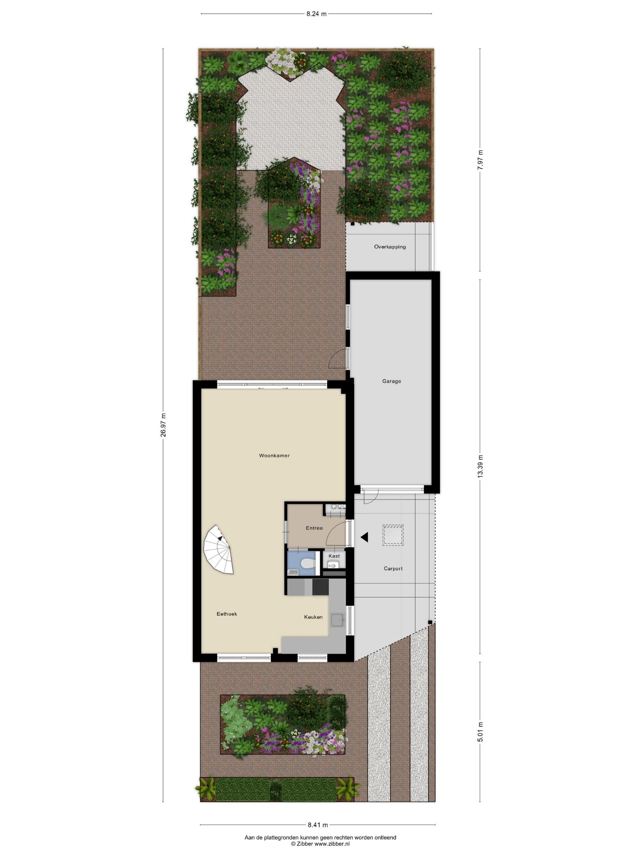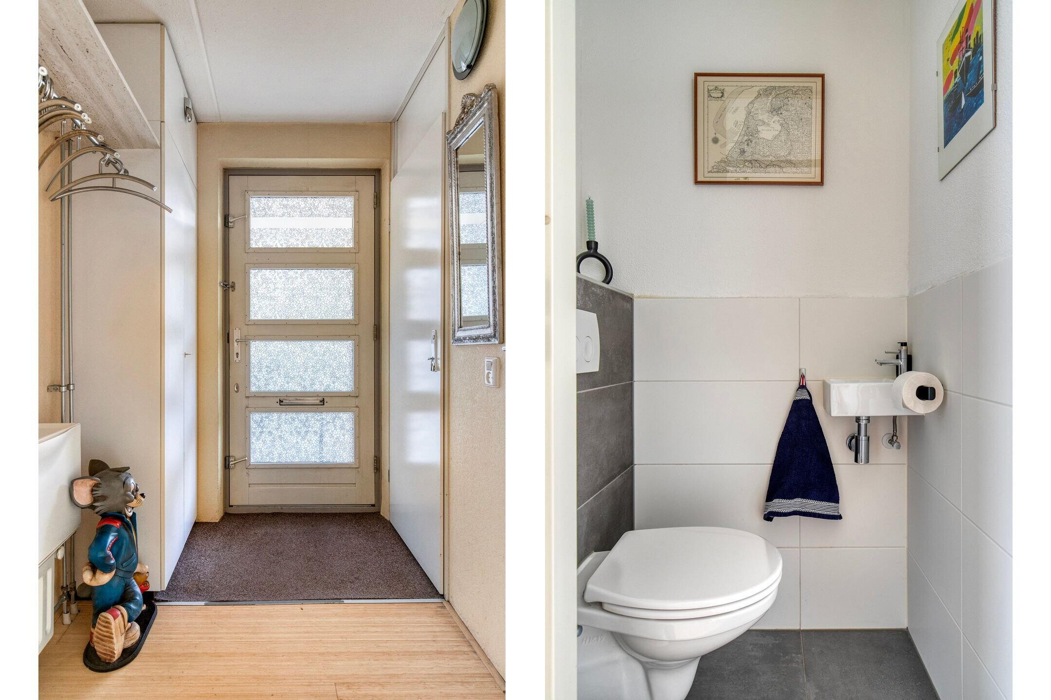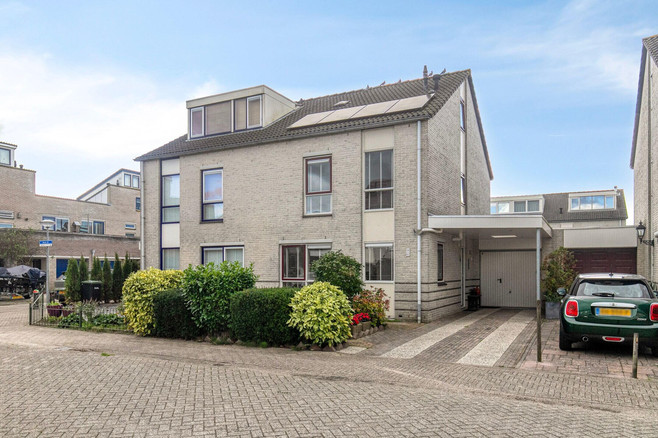 Ruime oprit met carport en de ruime garage voorzien van handige loopdeur. Entree met meterkast (glasvezel aanwezig), opstelplaats cv-ketel (Intergas HRE 2023), garderobe, toiletruimte met hangcloset en fonteintje en doorgang naar de woonkamer. De tuingerichte woonkamer is voorzien van een kunststof schuifpui naar de op het westen gelegen tuin met overkapping, elektrisch zonnescherm en toegang tot de garage. De straatgerichte keuken is voorzien van koel/vries combinatie, inductie kookplaat, afzuigkap, vaatwasser, combi oven/magnetron en handige carrouselkast. Wenteltrap naar de eerste verdieping.